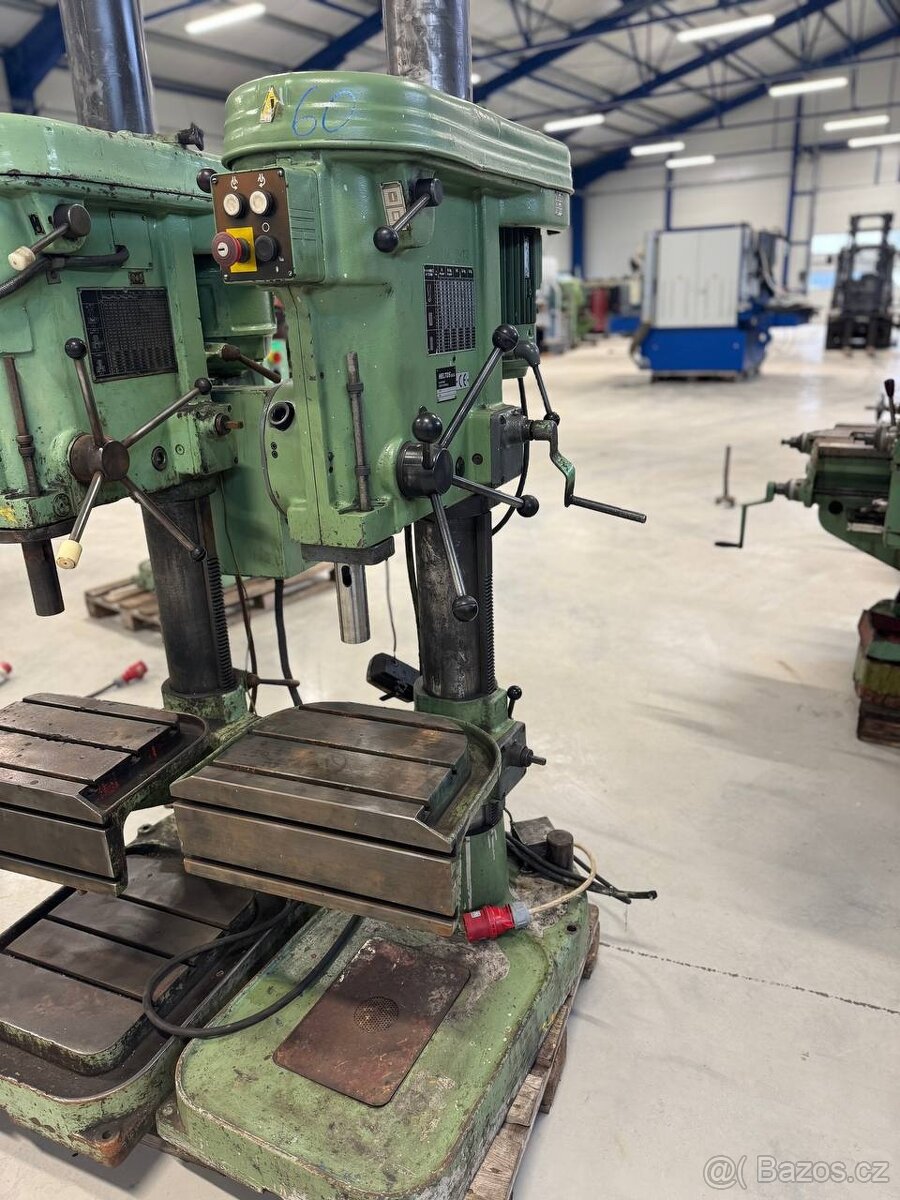 Plně funkční, velmi dobrý stav, naložení zajistíme, více infromací na tel. Sloupová vrtačka Heltos VS 32 B je robustní stroj určený pro vrtání, vystružování a řezání závitů v kusové i sériové výrobě. Její konstrukce se skládá z litinové základny a ocelového sloupu, na kterém je uchycen otočný vřeteník a stůl. Maximální průměr vrtání (ocel 600 MPa): 32 mm Hloubka vrtání: 200 mm Kužel vřetena: Morse 4 Výkon motoru: 2,2 kW Otáčky vřetena: 15 stupňů v rozsahu 56 až 2240 ot./min Počet stupňů posuvů: 4 Rozsah posuvů: 0,11 až 0,45 mm/ot. Typ spojky: Mechanická Upínací plocha stolu: 400 x 316 mm Průměr sloupu: 140 mm Maximální vzdálenost vřetena od stolu: 630 mm Hmotnost: 635 kg Rozměry (d x š x v): 620 x 1130 x 2080 mm