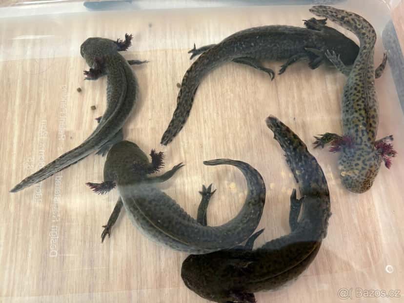Nabízím mláďata axelotla mexického. Mají okolo 15 cm, jsou naučený na granule, patentky a nítěnky. Cena 250 ,-