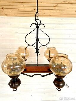 Starý mohutný kovaný lustr se dřevem
