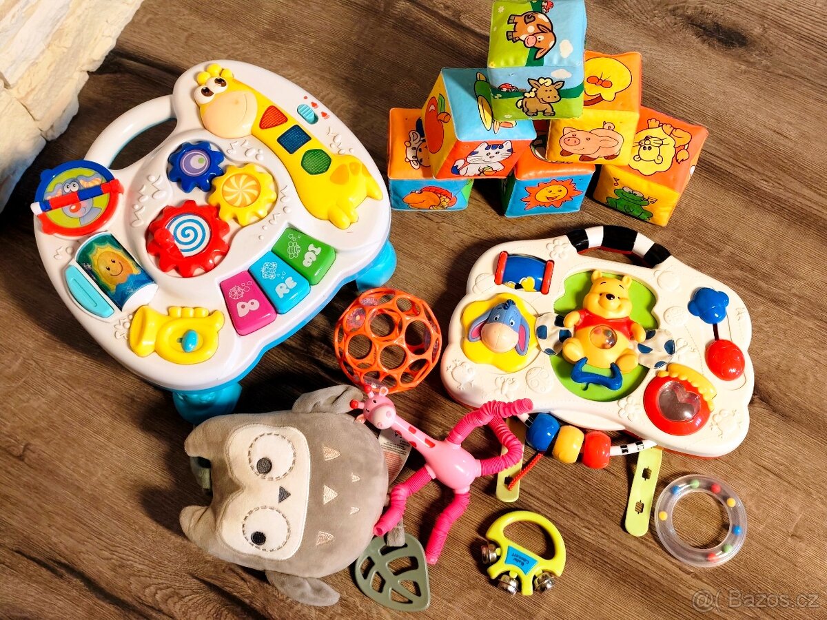 Prodám interaktivní stoleček na baterky, interaktivní panel, hrací sova, kostky apod.
