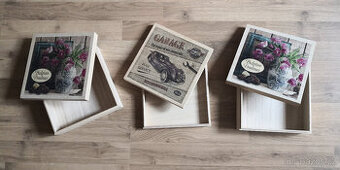 Prodám set tří nových dřevěných krabiček s víky s potisky o rozměrech: 2x 20,5x20x5x6,5cm a 1x 20,5x20,5x3,5cm. Prodám pouze dohromady jako set. Cena je za všechny tři. Osobní odběr v Havířově nebo zásilkovna. !NA DOBÍRKU NEPOSÍLÁM!
