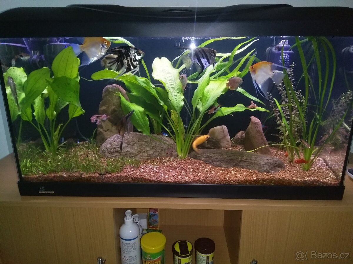 Nabízím k prodeji akvarijní komplet včetně skříňky. Rozměr akvária D80cm,V41cm,H36cm Stáří cca 5let, viz foto. Bohaté příslušenství: RGB kontroler, odkalovačka, filtry, spínací hodiny ... Preferuji osobní převzetí