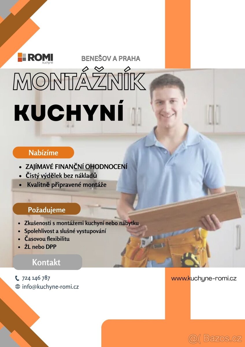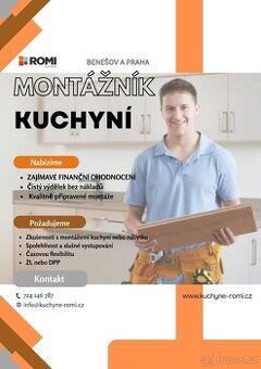 Pro montáže našich kuchyní převážně na benešovsku, v Praze a okolí hledáme spolehlivého truhláře /montážníka. Nabízíme: – zajímavé a odpovídající finanční ohodnocení - čistý výdělek bez nákladů – profesionální zaškolení – příjemné pracovní prostředí a kolektiv Požadujeme: – zručnost, spolehlivost, pečlivost – samostatné myšlení – flexibilitu – pro-zákaznický přístup – ŘP sk. B – praxe v oboru montáží nábytku výhodou
