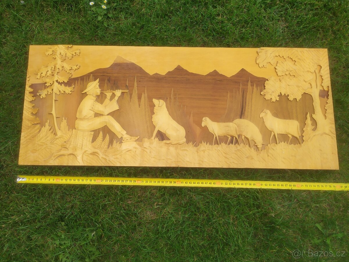 Prodám dřevěný obraz, ruční práce, 80x30 cm, pěkný kousek třeba na chatu.