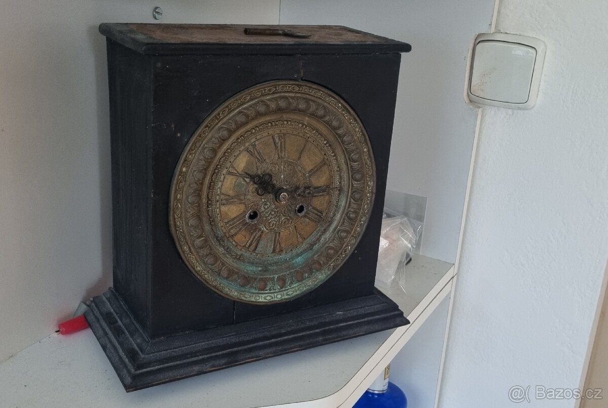 Prodám starožitné stolní hodiny v dřevěné skříni se zdobeným kovovým ciferníkem (římské číslice). Hodiny jsou určeny spíše k renovaci nebo jako dekorace – stav viz foto.