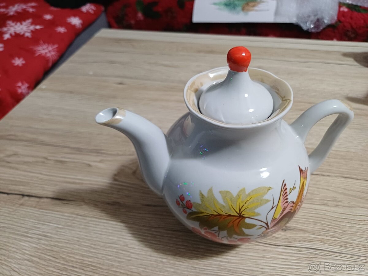 Cena: Nabídněte. Čajová konvička s motivem ptáčka s jeřabinami.Osobní odběr