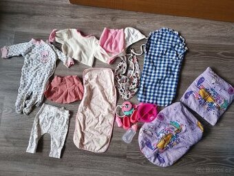 Oblečky pro panenku miminko, dečka do kočárku, zavinovačka, peřinka a polštářek, lahvičky.. vše viz. foto. Hrané. Cena za vše dohromady.