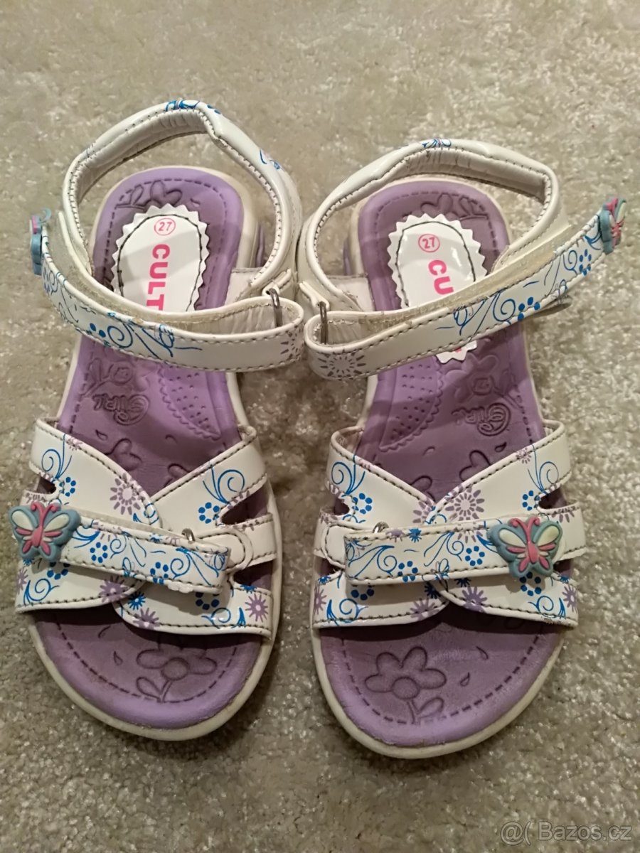 Prodám krásné dívčí sandále s motýlky, zn. Cult Kids. Na suchý zip, který krásně drží. Málo nošené. Uvedena vel. 27. Uvedena délka 18 cm, naměřeno na botě délka označené šlápoty 17,2 cm. Bez vad. Osobní předání Slavkov u Brna, Brno nebo mohu zaslat poštou nebo zásilkovnou.