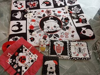 deka 70x89cm,výpln vatelín,zespod hebká minky, kousátka,hmatové prvky,karta se zvuky.. dále nahřívací polštářek pejsek,zvířátko do ručičky myška,muchláček beruška s kousátkem a knížečka... cena za vše