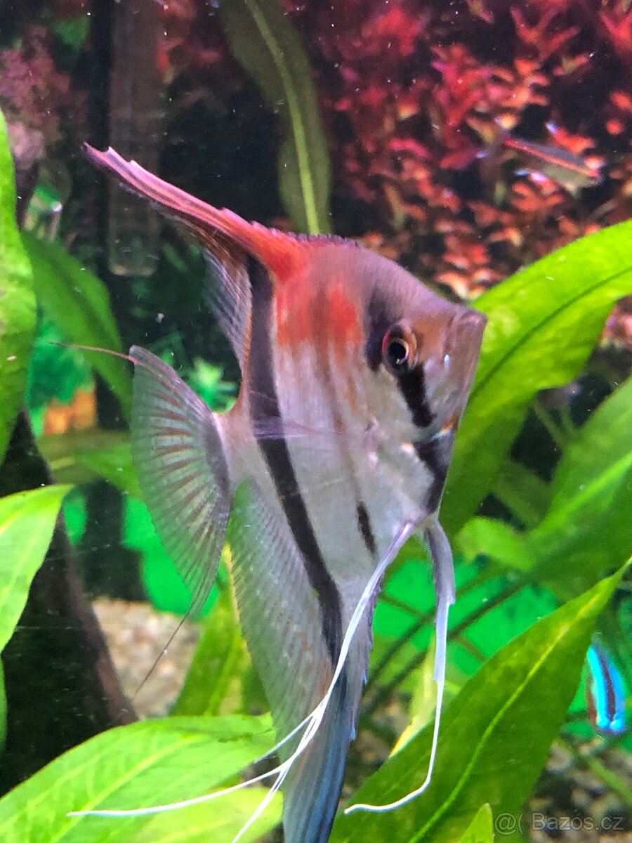 Cena: Nabídněte. Prodám 3 Skaláry manacapuru (Pterophyllum scalare 'Manacapuru'). Ryby jsou vitální, zdravé, krmené různorodou stravou. Občasně mohou mít “šrámy” z bojů. To je také důvod prodeje, ryby se mi začaly párovat, a vznikající hierarchie mi nedovolí ponechat si všechny, byť bych rád. Ryby jsou ve věku cca rok a půl. Ryby půjdou k někomu zkušenému, do větší nádrže. Ne někam do 60 litrového kyblíku! Na prodej nespěchám, cenu prosím nabídněte na mail, případně SMS. Inzerát je platný do smazání. Foto je ilustrační z nádrže, v případě zájmu zašlu fota všech 3 jedinců.