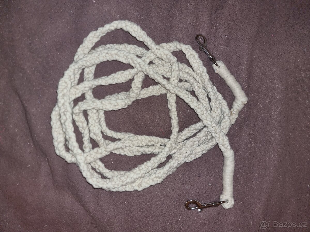 Ručně pletené vodítko. Délka 5. Je trochu natahovací. Lze využít jako lonžovací. Důvod prodeje: nevyužité