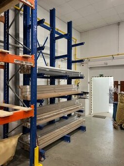 Prodám zánovní konzolové regály. Pozice 1: 1 ks ... META MULTISTRONG HEAVY Jednoduchá řada Celková hloubka: 815 mm / Délka ramen: 500 mm / Výška: 4 000 mm / Výška nejvyšší ukládací úrovně: 3 500 mm / Celková délka: 2 135 mm / povrch: RAL 5010 enciánová modrá Počet polí: 2 / Osová vzdálenost : 1 000 mm / Počet ramen na regál : 5 / Nosnost ramen : 500 kg / Využitelné zatížení stojiny jednostranně: 2 500 kg / Zatížení nohy stojiny: 2 500 kg