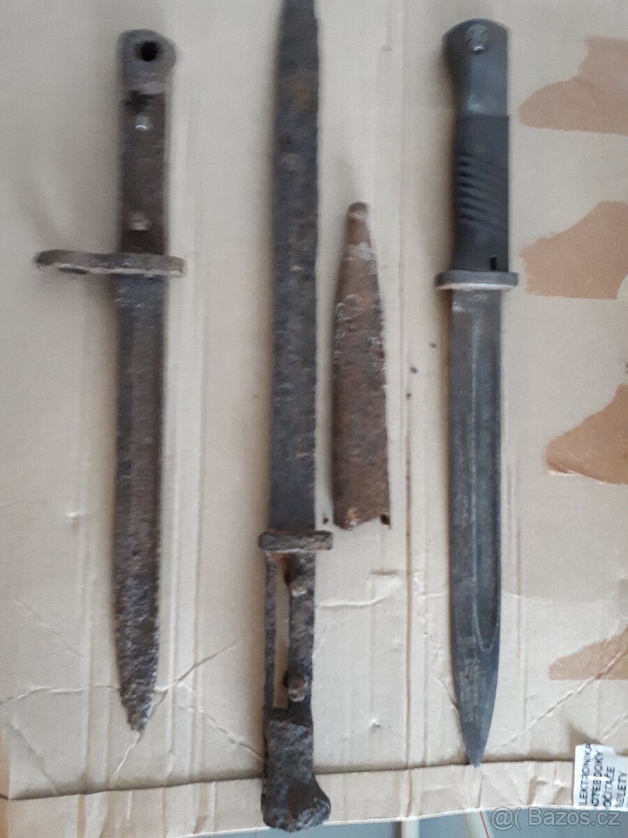 Nabízím k prodeji 3 kusy bodáku - bajonetů. 1 x kopané Mannlicher vz. 1895, 1 x vz. 24 targentLang CS contex, 1 x půdní nález Mauser.