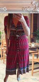 Dámské halenkové / košilové maxi šaty s 3/4 rukávy a stahovacím páskem ✒ celopropínací na knoflíky ✒ v pase stahovací šňůrka ✒ 3/4 rukávy s rozparky, lze ohrnout a připnout páskou ✒ na sukni vepředu vysoký rozparek ✒ příjemný materiál, nepruží: 100% polyester (na dotek jemný jako viskóza) ✒ ve velmi pěkném stavu ✒ vel. psaná L, unosí i M/38 (foceno na postavě 38/178), délka 134cm, prsa cca 48cm x2, boky cca 56/57cm x2, 3/4 rukáv 41cm od ramene + poštovné ideálně Zásilkovna 89 Kč nebo Balíkovna 75 Kč PODMÍNKY PRODEJE (prosím čtěte): - v případě zájmu, pište přes formulář pod inzerátem (nabídek mám více, tak ať vidím, o který předmět se přímo jedná) - pokud neobdržíte odpověď na svůj dotaz, prosím, ozvěte se znovu (stává se zde, že ne vždy zprávy dorazí v pořádku) - kvůli nevhodným telefonátům, perverzním nabídkám a v poslední době šířícím se podvodům, komunikuji pouze přes email, vážným zájemcům odpověď posílám velmi rychle (na SMS a WhatsApp neodpovídám) - poštovné a balné zobrazeno