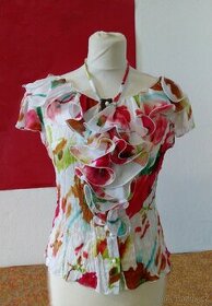 Vhodná do společnosti, materiál lehoučký, takže ideální na léto (100℅ viskóza). Parkrát vzatá, je jako nová, žádné vady. Má zavazování kolem krku a rozepínání na knoflíčky.