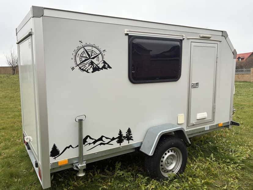 Prodám minikaravan. Malý, lehký, skříňový, brzděný přívěs značky Niewiadóv, nájezdová brzda KNOTT, celkové rozměry: délka 4,5m, šířka 2,02m, výška 2,07m bez střešního okna (výška okna +10,5cm), vnitřní rozměry: délka 3m, šířka 1,5m, výška 1,48m, provozní hmotnost 450kg, povolená hmotnost 750kg (k osobnímu vozidlu stačí ŘP sk. B), max. rychlost 100km/hod. Kola 185/80R14C, z výroby zvýšený podvozek, 2x výsuvná opěrná noha. Rok výroby 2021 – najeto do 1000km, 1.majitel, STK do 13.5.2029. Boční vstupní dveře, zadní výklopné dveře. Provedena kempovací vestavba – spaní pro dvě dospělé osoby + malé dítě (šířka postele 1,5m/délka 2m) – s předstanem lze spaní rozšířit min. o další 4 osoby, možnost složení spací vestavby pro denní sezení se stolem, pod postelemi úložné prostory s plastovými boxy, kanystr na vodu s kohoutkem, samostatný prostor s přenosným WC, vestavba skříněk, šuplíku a kompresorové lednice. Vnitřní elektroinstalace – napojení na 230V v kempu s osazenými zásuvkami 230V (1x nad š