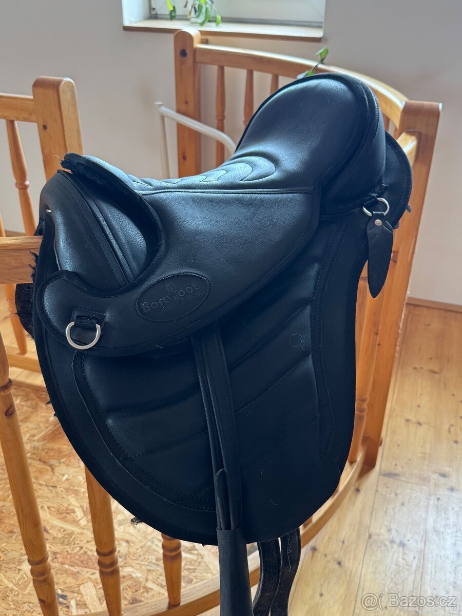 Nabízím k prodeji pěkné , černé sedlo Barefoot Cheyenne DRY-TEX. Velikost 1, uvnitř sedla červená komora. Komory lze měnit. Poutka a úchyty vše kompletní. Sedlo má VPS systém. Sedlo je pohodlné křesílko. Je lehoučké. Lehké na údržbu. Používáno v terénu. Ideální i na delší vyjížďky. Sedlo prodávám i s originálními třmenovými řemeny + originál potah na sedlo. Mohu k sedlu nabídnout bezpečnostní třmeny s košíky ,vytrvalostní. S našlápnou,vyztuženou plochou.Kupované na 4horse. - za 1000kč. Viz foto. Ve velmi pěkném stavu. Inzerát platí do smazání.