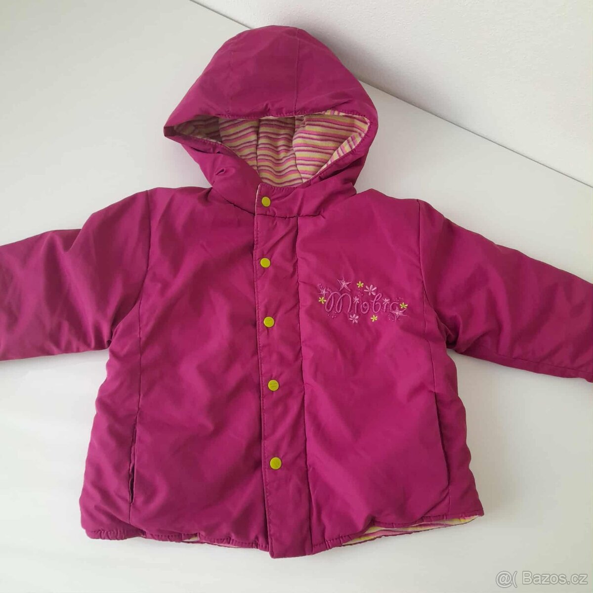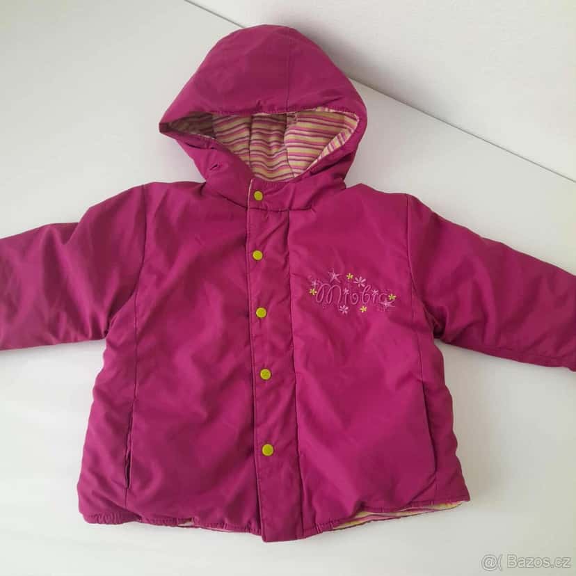 Bunda s kapucí vínové barvy s žlutými cvočky, žlutou pruhovanou podšívkou (zapínání na druky i na zip). Délka 32cm, šířka 2x32cm. Bez vady. Velikost 68