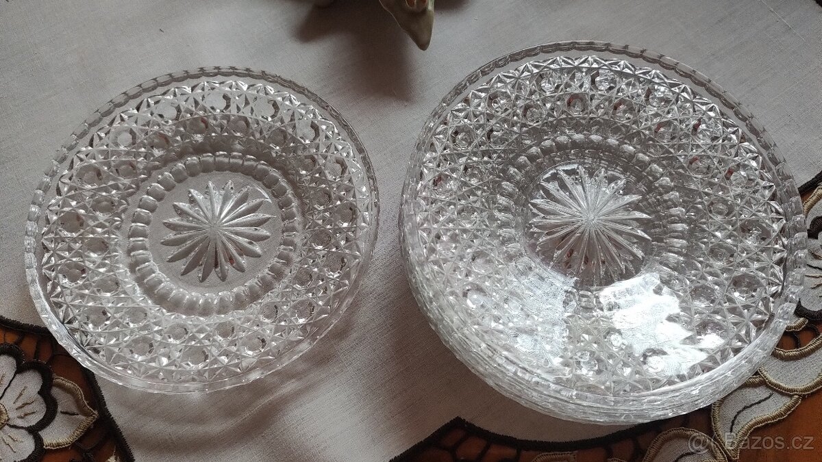 Skleněné broušené servirovací talíře, vhodné na dorty, zákusky, cukrovinky apod. celkem 6 ks, cena je za všechny, viz foto. Karviná.
