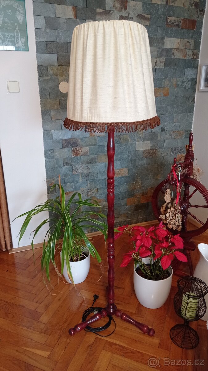 Stojatá lampaNabízím hezkou stojatou lampu z tvrdého dřeva, výška 155 cm, průměr stínidla nahoře 30 cm, ve velmi pěkném stavu.