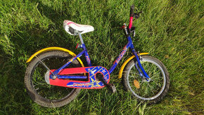 Perfektní dětské kolo pro přechod z odrážedla. Snadné nasedání (jen spodní tyč) Blatníčky se hodí k loužování v dobrém stavu, helmička bonus.