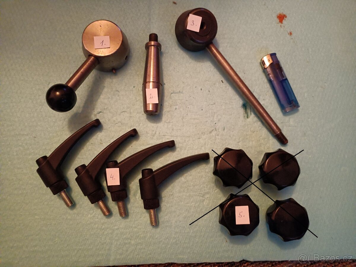 Cena: V textu. Prodám viz foto č.1 - 100,- č.2 závit M12x15 - 100,- č.3 - 100,- č.4 šroub M10x20, stisknutím lze pootočit do libovolné polohy - 50,-/ks č.6 - závit M8x28 - 20,-/ks č.7 - závit M8x26 - 15,-/ks č.8 - závit M6x15 - 10,-/ks Při koupi všech cena 500,- Prodám šrouby k soustruhu U všech závit TR 18x3 Cena 300,-/ks Příslušenství k frézce Cena 300,- Technické knihy, viz foto. V případě zájmu ceny nabídněte. Prodám menší láhev CO2. Cena 600,- Prodám kleště na sváření, viz foto Cena 100,- za oboje