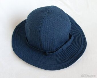 Ručně vyrobený letní modrý klobouk. Korpus i krempu má bohatě prošívanou, díky čemuž je poměrně pevný a drží tvar. Ozdobený je drobnou mašličkou. Materiál je pevnější tkanina, barva nejvíce podobná džínové modré, podšitý je béžovou podšívkou. Rozměrově sedí na menší obvod hlavy 54,5 cm, průměr krempy je 33 cm. Je to jarní až podzimní záležitost, k šatům nebo kostýmku, na zimu se nehodí. Byl minimálně nošený, resp. možná vůbec, v top stavu jako nový. Odeslání poštou, Balíkovnou nebo Zásilkovnou. Cenu za odeslání dám vědět předem.