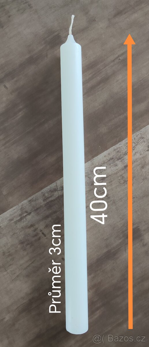 Prodám bílé tyčkové svíčky o průměru 3cm a výšce 40cm z kvalitního parafínu.