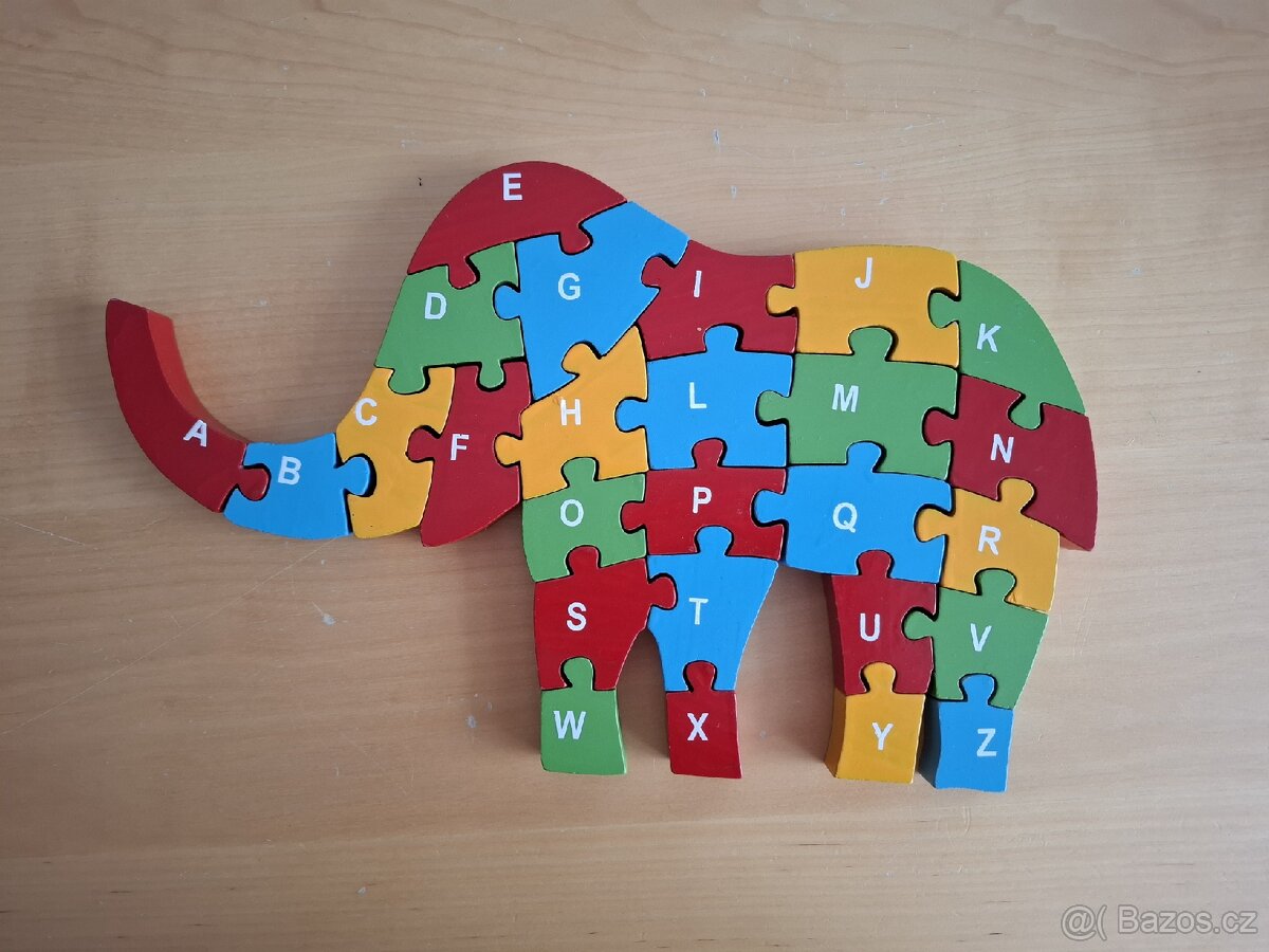 Prodám dřevěné puzzle SLON. Z jedné strany jsou dílky popsané písmeny, z druhé strany čísly. Stav dobrý, po dvou dětech. Preferuji osobní předání, nezasílám.