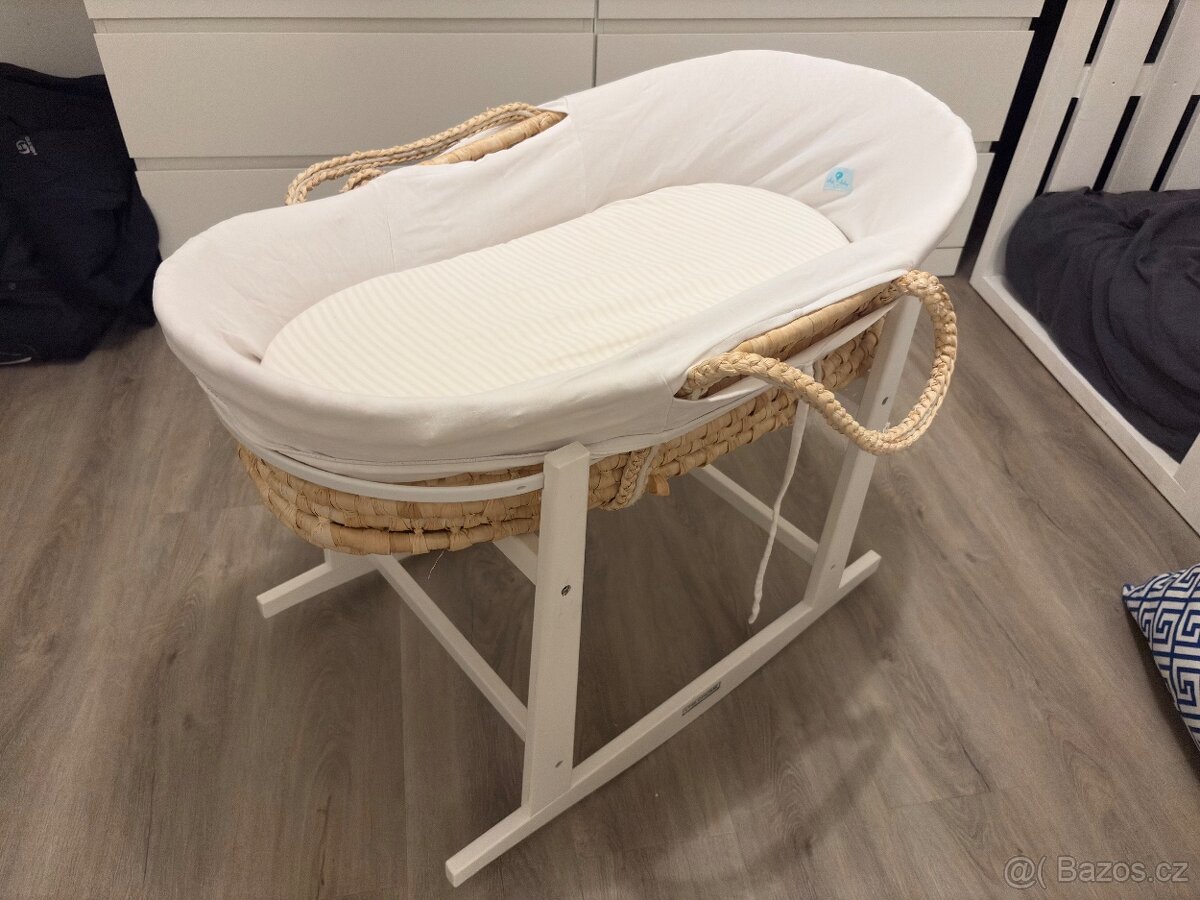 Mojžíšův koš, používaný ale stále v dobrém stavu, jen tvarově trochu zdeformovaný, na funkci nemá vliv. Součástí houpací podstavec, látka přes koš která nerovnosti skryje a dvě prostěradla na matraci.