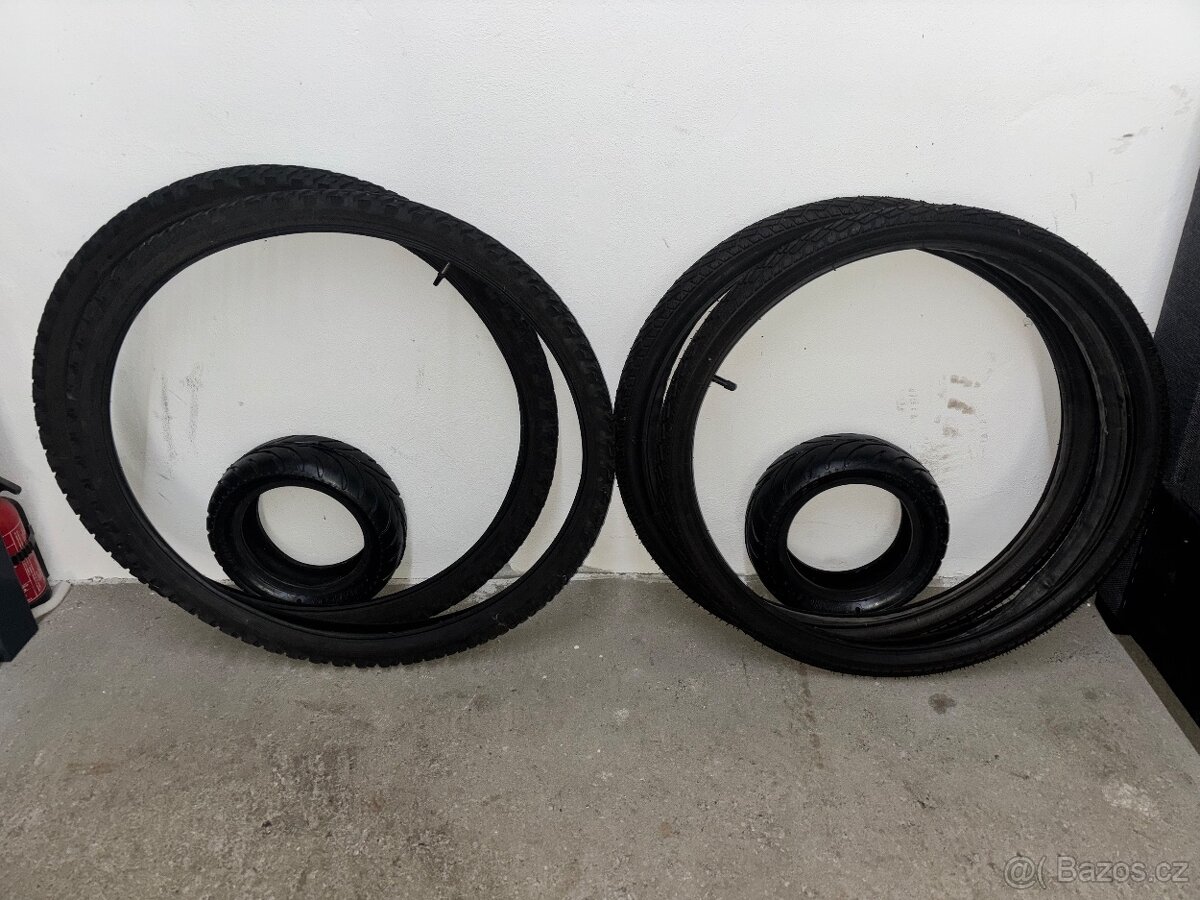 Prodám pláště na kolo i s dušemi. Pláště s hrubý vzorkem o rozměru 26x1.95 (50-559) KENDA mají vzorek 3 a 2,2mm,nejsou zpuchřelé a jsou už lehce jeté. Pláště s hladkým vzorkem o rozměru 24x1,75x2 (47-507) RUBENA jsou nové nepoužité(mají nitky) a mají vzorek 2mm. A ty malé pneu jsou na elektrokoloběžku o rozměrech 110/50-6.5 a jsou také nové, vzorek mají 3mm.