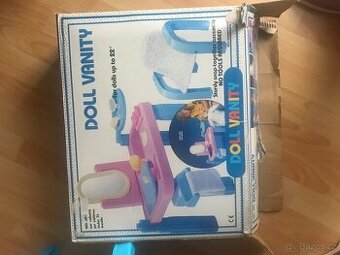 Plastové retro kadeřnictví v originální krabici, rozložitelný stoleček i židle pro panenku, velmi pěkný stav