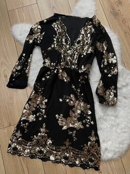 Dámské elegantní černo zlaté šaty s flitry vel. STop stav, bez vad, mají podšívku. Délka: 87 cm, přes prsa: 37-44 cm, pas: 29-44 cm