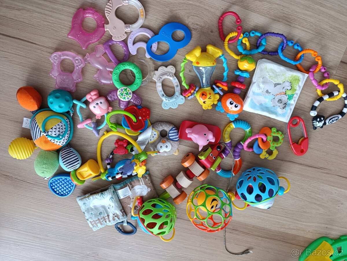 Prodám mix hraček pro miminko. Chrastitka, kousatka, knížky...Viz foto.