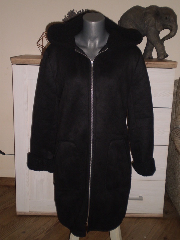 Vše nafoceno, kapuce na pevno, dvě kapsy, vzadu malý rozparek, mírně projmutá, dvoucestný zip. Kožíšek uvnitř všude, včetně rukávů. Moc hezký. Na povrchu vzhled kůže. Vel. sedí. délka- 89, prsa- 55, pas- 52, rukáv od ramene- 57, boky- 55 cm