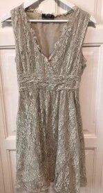 Prodám hezké šaty v pěkném stavu, Barva lehce krémová nebo slonovinová kost. velikost neuvedena ale jedná se cca o M/L, rozměry jsou uvedeny na fotce. Přes prsa cca 2x 46 cm, vhodné i pro větší poprsí pas 2x 36 cm, je pružný délka 99 cm, šaty mají i spodničku, která šaty lehce nadzvedává