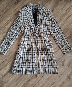 Zara sako/ kabátik Veľkosť: EUR S / USA S Klasický károvaný vzor (houndstooth / tvídový vzor) – kombinácia čiernej, bielej, zlatej. Zlatý reťazový opasok – dodáva kabátu elegantný a moderný vzhľad.