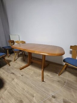 Prodám stůl 1,45 m × 0,95 m, v rozloženém stavu 1,85 m × 0,95 m. Také 4 židle. Cena stolu 1000 korun. Cena za 4 židle 400 korun.