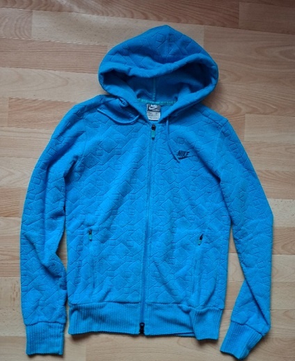 Kupovaná nová, nošená. V dobrém stavu. Uvedená velikost S. Rozměry: délka: 59 cm; šířka (měřeno pod průramky) 45 cm; délka rukávu (od kapuce): 73 cm. #10