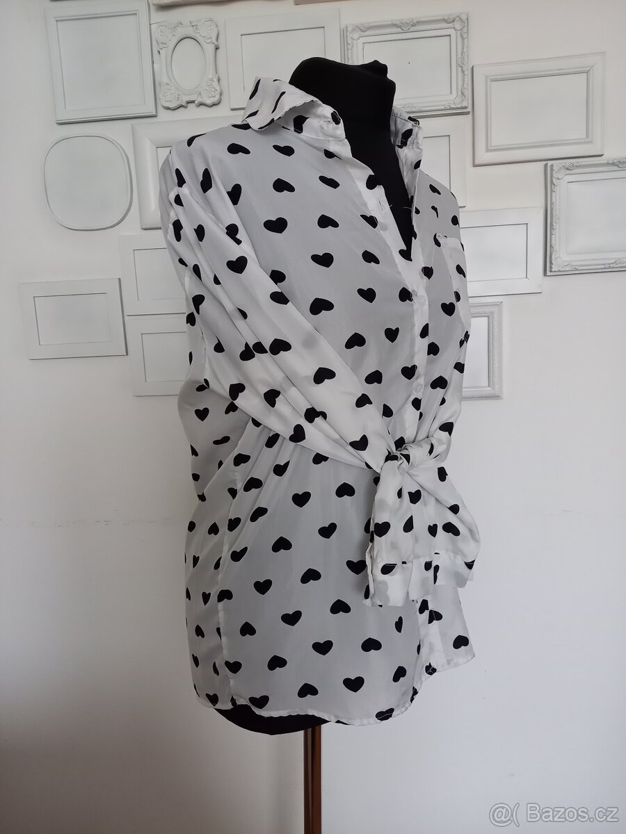 Bílá košile s černými srdíčky, retro vintage styl. Velikost M, odpovídá. Materiál neuveden, pravděpodobně polyester. Lehce průsvitná, velmi vzdušná, ideální na léto. Střih není projmutý, na prsou kapsička, v průramcích 2 x 50 cm, délka 65 cm. V top stavu, dole asi milimetrová dírka, která půjde velmi snadno zašít, minimálně nošená.