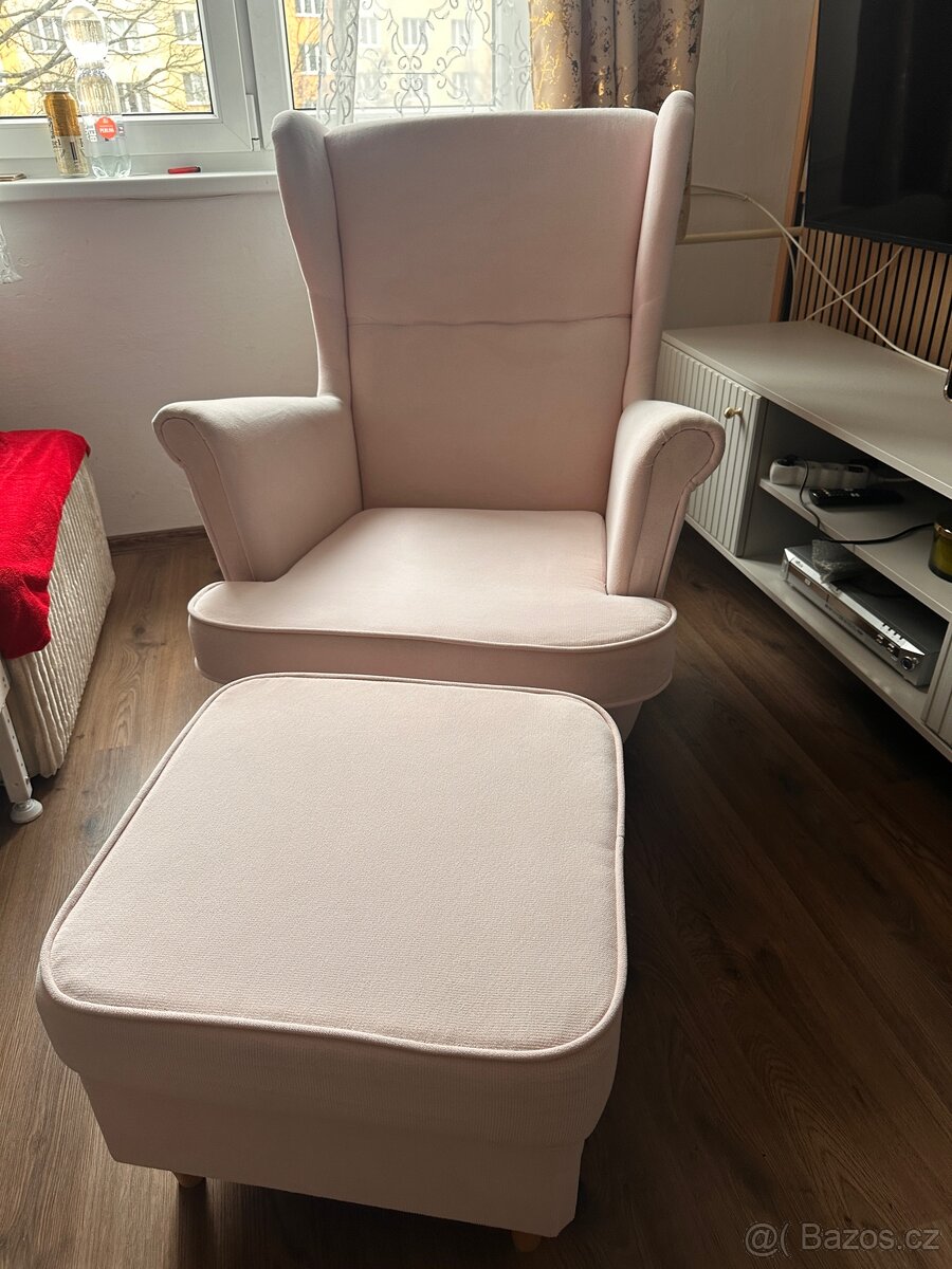 Světle růžové křeslo i s podnožkou. Velmi dobrý stav .