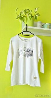 Dámská halenka s 3/4 rukávem a ozdobným potiskem The Wéss. Velikost Uni, odpovídá 38, prsa: 112cm, 90cm, boky: 96cm, délka: 64cm, délka rukávů od krku: 53cm. Pohodlný jemný materiál 100% bavlna a elastan.