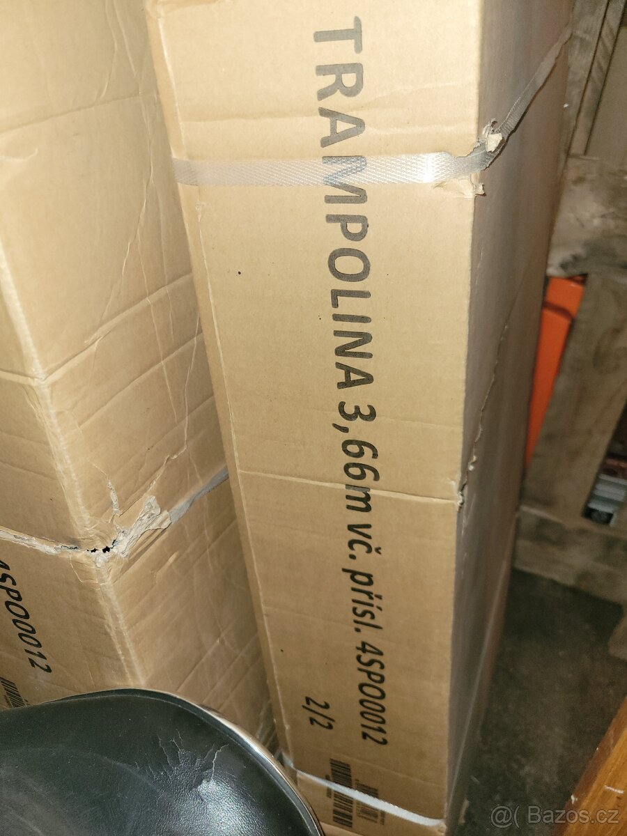 Úplně nová nerozbalena Trampolína o rozměru 3,66 m. Nosnost trampolíny je 150 kg. Stabilitu zajišťují 4 nohy. Parametry ochranné sítě: Průměr trampolíny: 3,66 m Průměr sítě: 3,18 Výška sítě: 1,80 m Počet tyčí sítě: 8 Druh sítě: vnitřní Tyče - průměr ; síla: 25mm, 1,2 mm Obaly tyčí: ano, měkčené Rozměry a hmotnost balení: 149 x 50 x 21 cm = 46 kg a 132 x 44 x 14 cm = 21 kg Hustší výplet ochranné sítě, vysoká pevnost a odolnost Zesílená horní obruč UV ochrana odrazové plochy Odolný PVC kryt pružin (PVC 350 g/m2) Certifikováno dle normy EN-71 Kovové části trampolíny jsou z galvanizované oceli