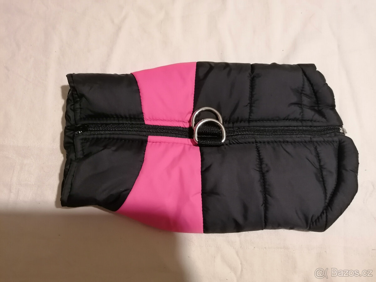 Zimní černo/sytě růžová bunda pro menší psy, voděodolná, zapínání na zádech na zip, s poutky na vodítko, vel.M (celková délka 30cm), zn.Feimax. NOVÁ 250 Kč č.383