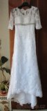 Prodám krásné bílé svatební šaty, s krajkovými rukávky. Vrchní díl tyl s ručně našívanou zdobenou krajkou. Vzadu vlečka. Vel. cca 38, délka vpředu cca 150 cm, přes prsa cca 94 cm. Zapínání vzadu na zip, který je pokryt našitými potaženými knoflíčky. Šaty využity jednou - pouze obřad. Možnost vyzkoušení v Praze. Prodej pouze po ČR, příp. Slovensko