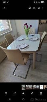 Nabízím tento jidelni stůl pevny,kovové nohy,bezpečnostní tlusté mlecne sklo,možné rozložit.my ho nikdy neměli rozložený, kdyz je rozlozeny tak je kompaktni bez mezer ne jako na fotografii.pouze osobní odběr.rozmery,délka: 140 cm,šířka 90 cm,výška 75 cm.rozlozeny delka: 200 cm,bez židlí.barva nohou cappuccino