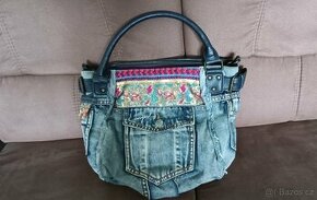 Modrá džínová kabelka Desigual . Kabelka obsahuje vnější kapsa na knoflík, vnější kapsa na zip, 2 vnitřní kapsy na zip 1 vnitřní bez zipu. Rozměry 40×29×13 cm. Délka ucha 16 cm, odepinat. popruh - 55 cm. Odpovím na SMS. Cena 750 + poštovné