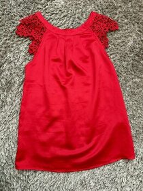 Elegantní halenka s ažurovým vzorem na rukávech, přední díl je lesklý satén, zadní je z elastického materiálu, velikost XS, výrazná červená barva. Halenka je zcela nová, nenošená, pouze skladovaná. Na předním díle je drobný nop (kaz), velikost cca 2 mm - uvádím pro úplnost.
