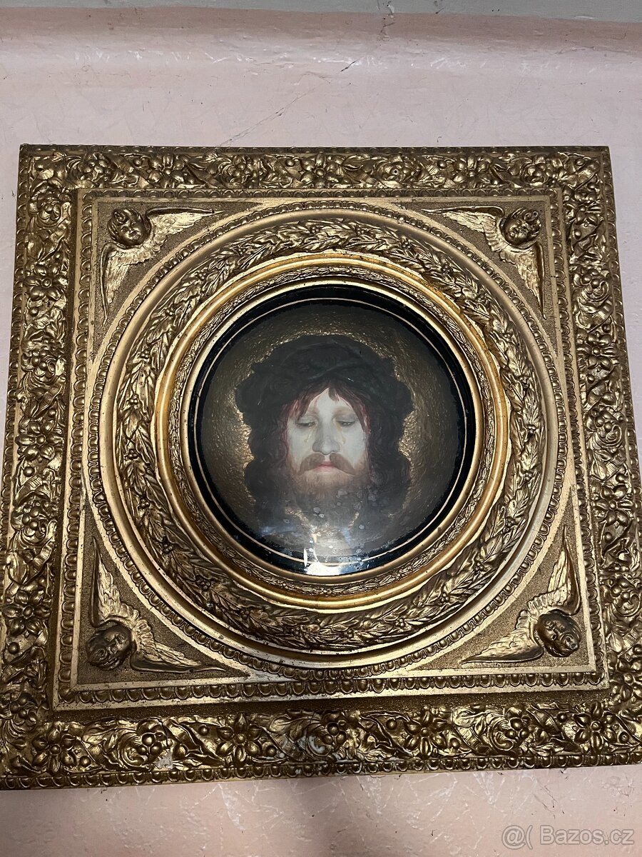 Prodám obraz reliéfu Krista v bohatém pozlaceném rámu.