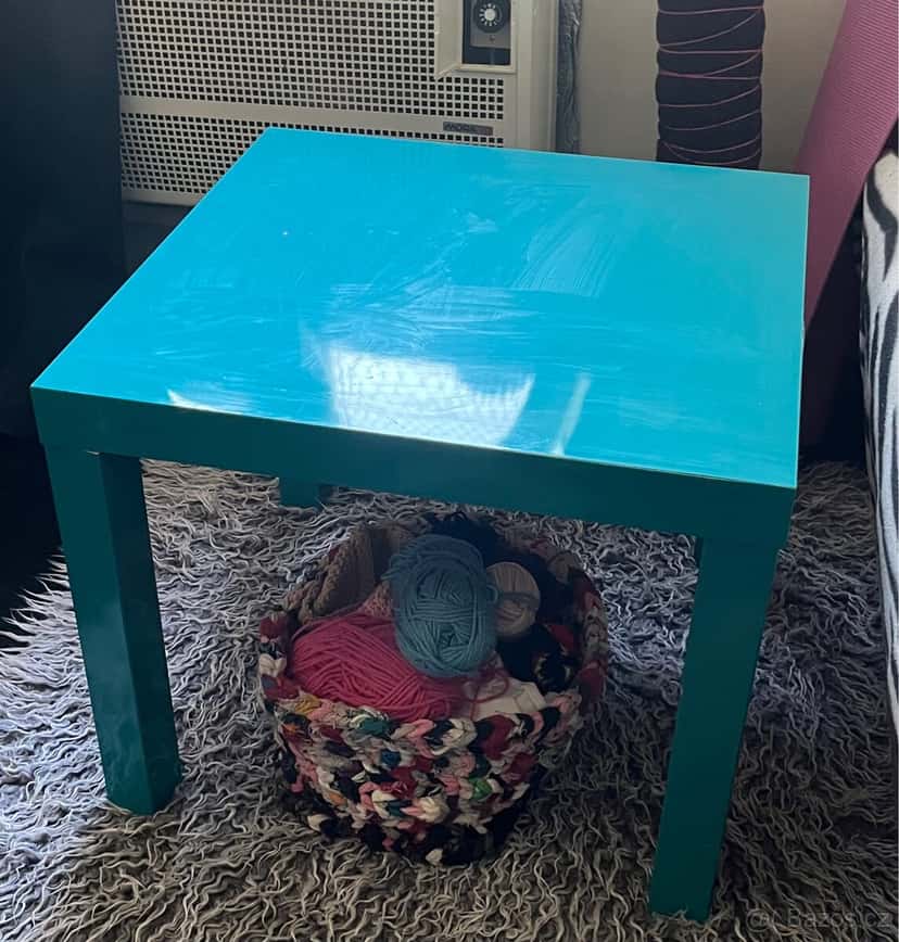 IKEA tyrkysový stolek. Trochu poškozený na straně a nahoře. Nevolat. Pouze SMS/mail/whatsapp